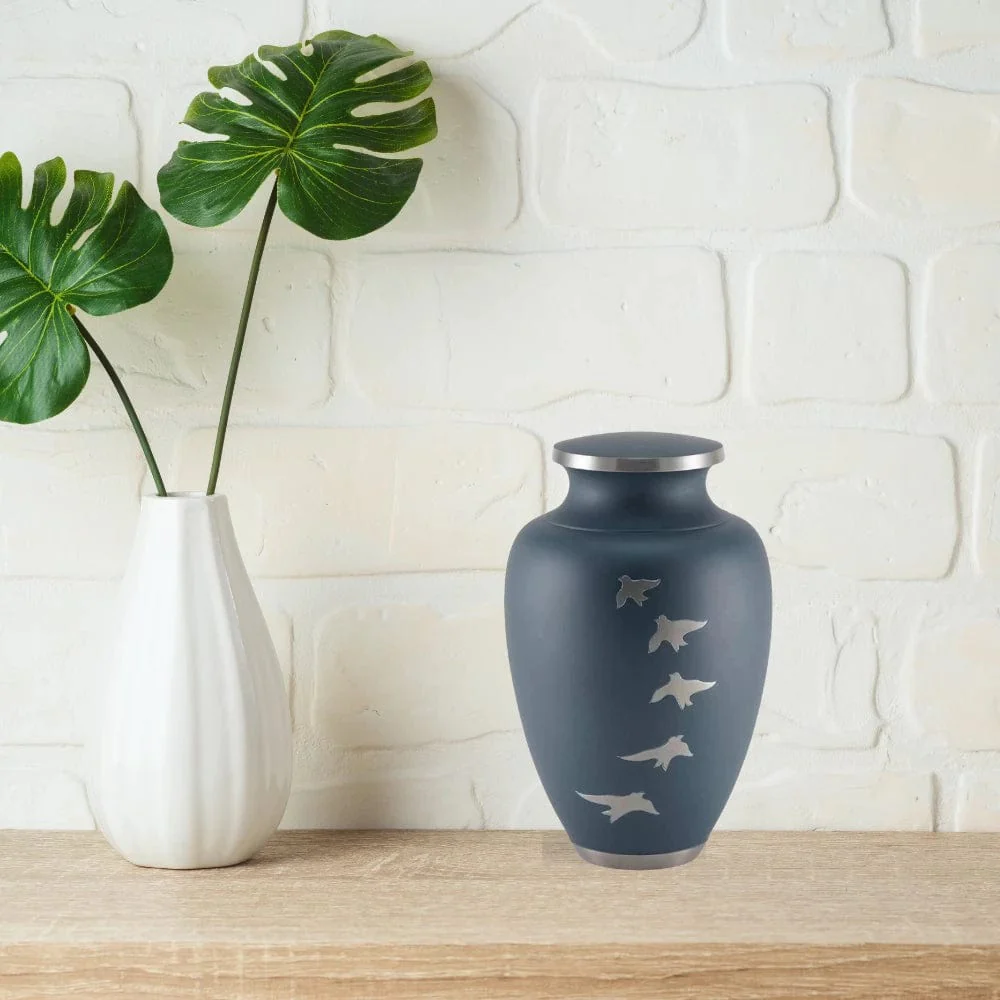- UNIQUE DESIGN. The urn presents a unique design of birds with a matte blue finish.