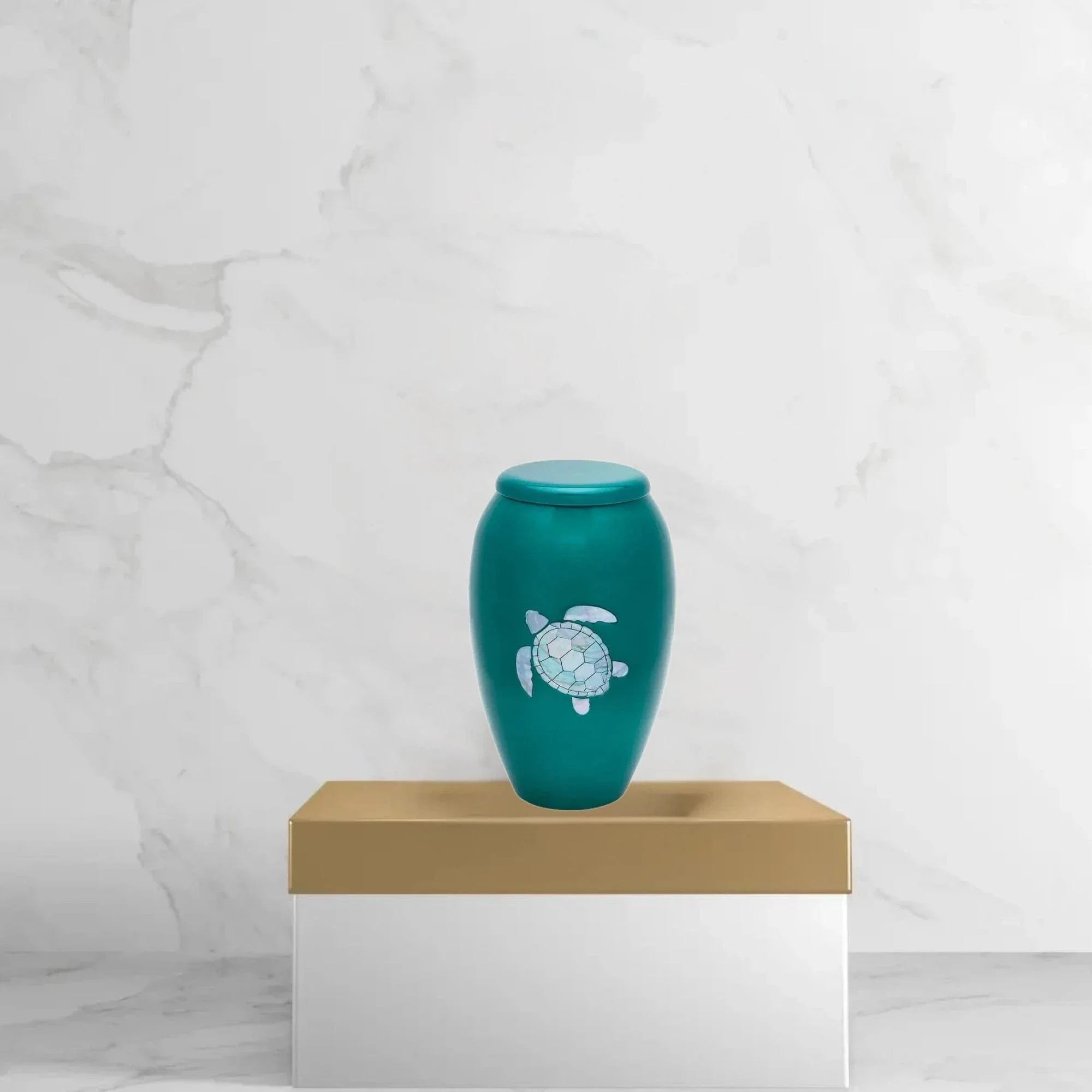 Behold the captivating Aquamarine Sea Turtle Adult Urn, a stunning portrayal of a sea turtle, gracefully depicted on a brilliant aquamarine urn. The intricate sea turtle design is meticulously handcrafted using genuine mother of pearl, adding a touch of elegance to this masterpiece. Constructed with 100% high-grade aluminum, this urn ensures durability and longevity. The urn is equipped with a threaded, airtight screw-on lid, securely preserving the contents. Choose the Aquamarine Sea Turtle Adult Urn as a symbol of grace, beauty, and the cherished memories of your loved one.