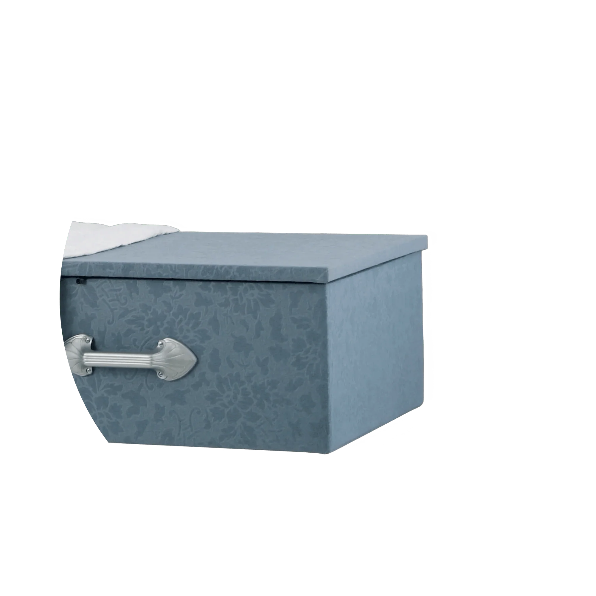 The cloth-covered casket features a subtly-patterned blue/gray cloth finish, a corrugated cardboard shell, and a flat top. This beautiful coffin is sophisticated in its simplicity and is a classic, elegant casket to pay tribute to your loved one. This casket comes fully assembled and ready for use.