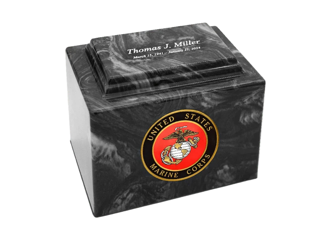 The marines black cultured marble urn accepts engraving directly on its surface, allowing for personalized text and artwork in a contrasting gold or white fill color to create a truly unique tribute. Alternatively, a separate brass plate can be engraved and affixed to the urn if you prefer.
