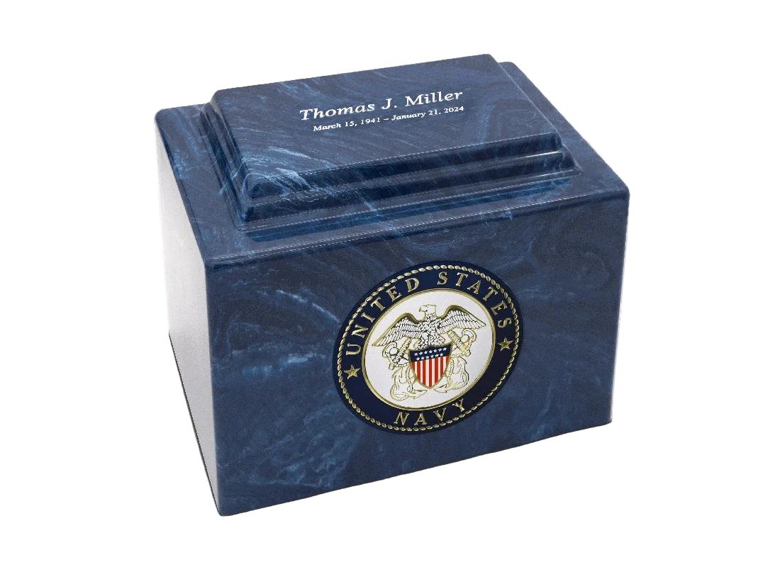 The blue cultured marble urn accepts engraving directly on its surface, allowing for personalized text and artwork in a contrasting gold or white fill color to create a truly unique tribute. Alternatively, a separate brass plate can be engraved and affixed to the urn if you prefer.